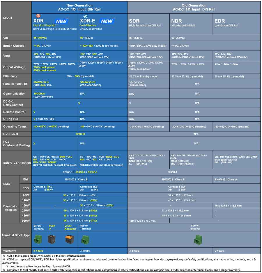 Compared with the previous generation SDR/NDR/EDR families, which have been on the market for over 10 years, the new generation XDR/XDR-E families offer: more compact size, more complete model lineup, improved specifications, more safety certifications, longer warranty period, etc. Overall, the new series shows significant improvements over the previous generation (see comparison table below for details). The new generation XDR/XDR-E series can directly replace the previous generation products. Customers can flexibly choose between the premium flagship XDR series or the high value XDR-E series based on their specification requirements and application scenarios, achieving high efficiency and optimal cost performance while enhancing overall system competitiveness.