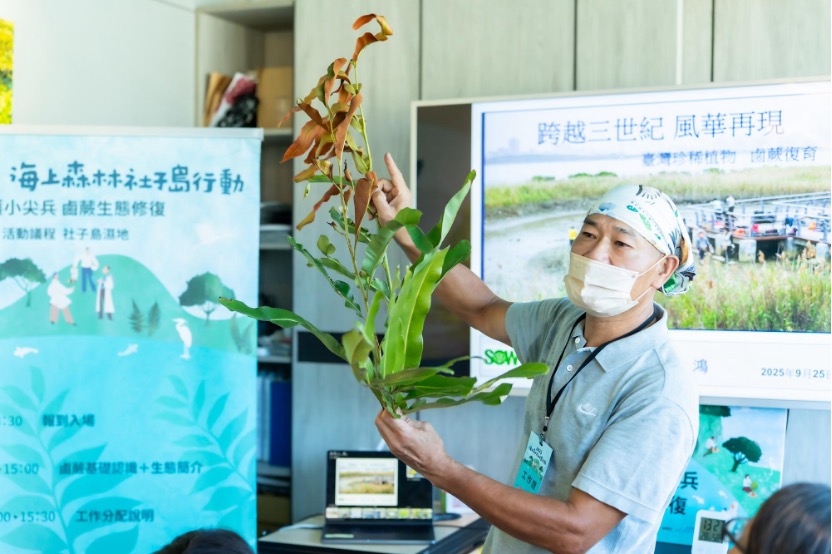 ▲ Mr. Chen introduces Acrostichum aureum, a species once vanished from this land and now rediscovered by the public.